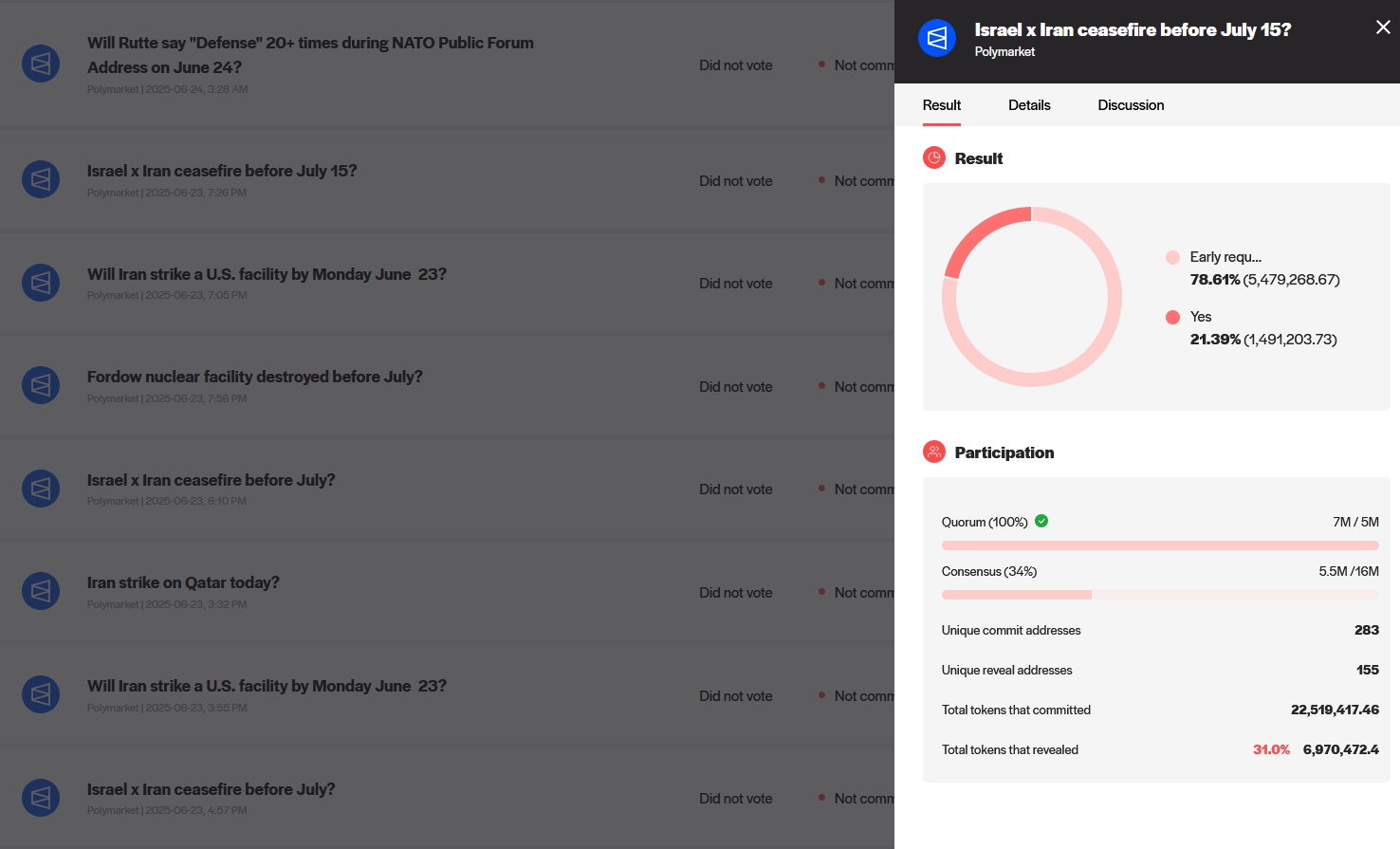 If a vote fails to meet either condition, it will roll over to the next voting cycle. The most times a proposal has been rolled over is three, but it can roll over up to four times. A rollover means the voters will vote on the resolution again. In rollovers, voters can reevaluate any existing or new evidence and change their vote. Because the initial vote did not meet quorum or consensus, it is not counted. Polymarket can step in if the delay is causing problems for resolving a market.